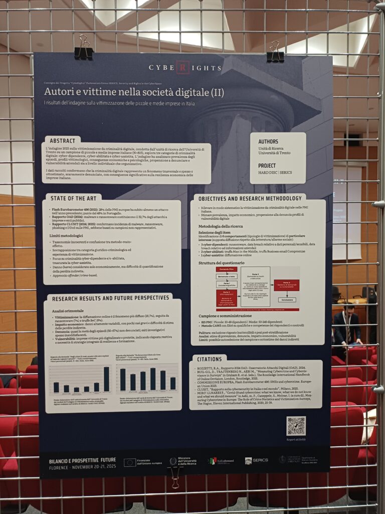 The event also included a poster session, where Beatrice Rigon, Bianca Donati and Beatrice Pattaro presented findings from victimization survey on digital crime, conducted by the Trento Research Unit among individuals and small and medium-sized enterprises.